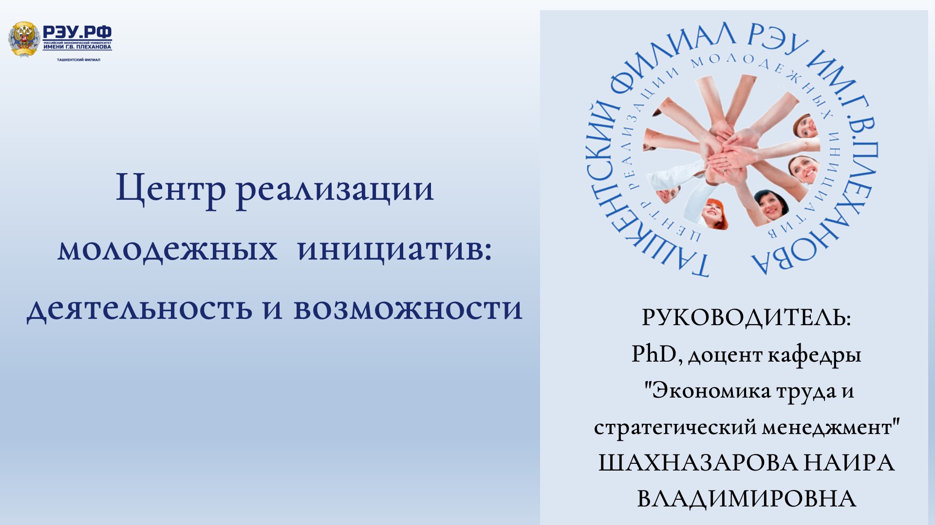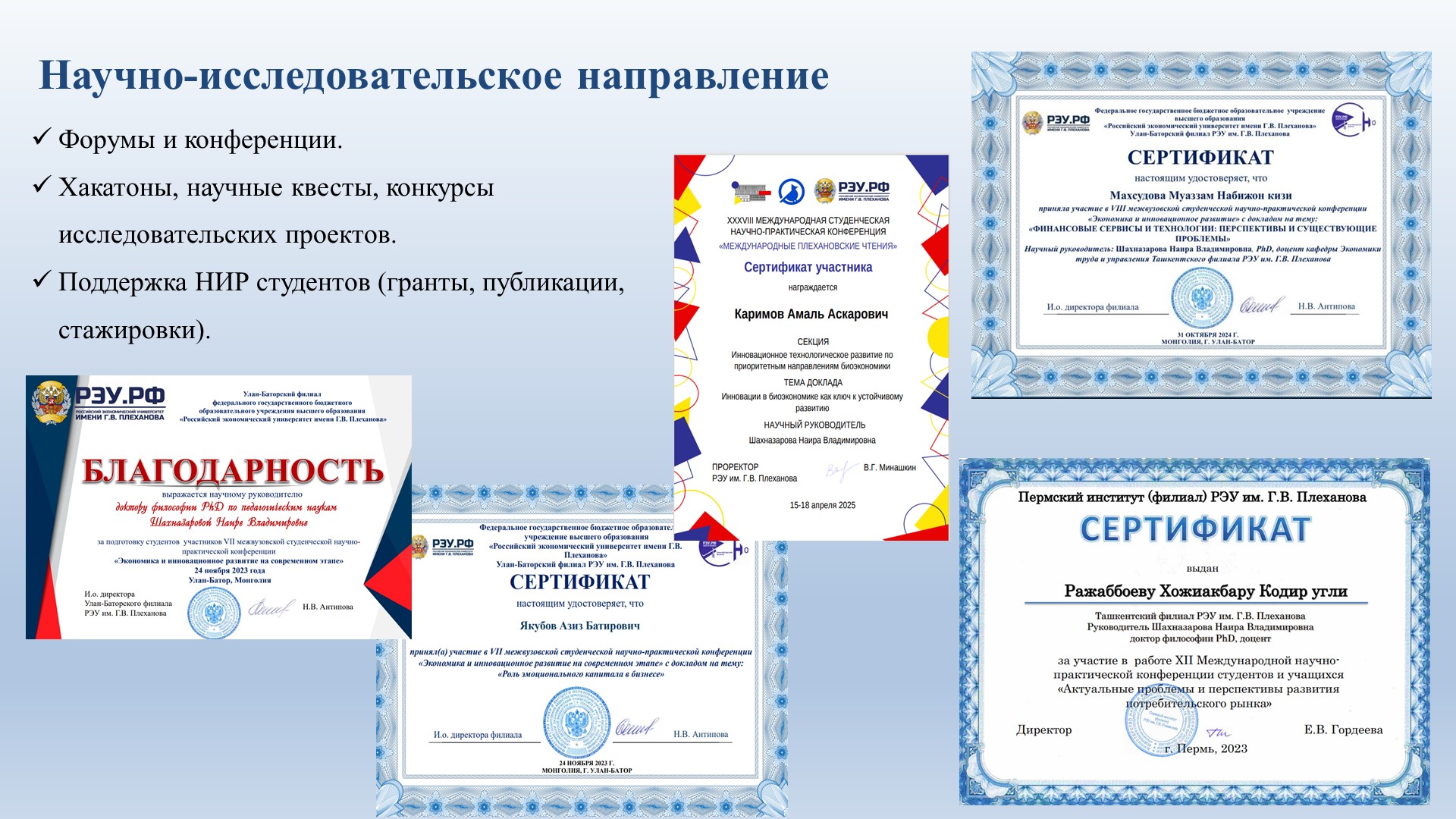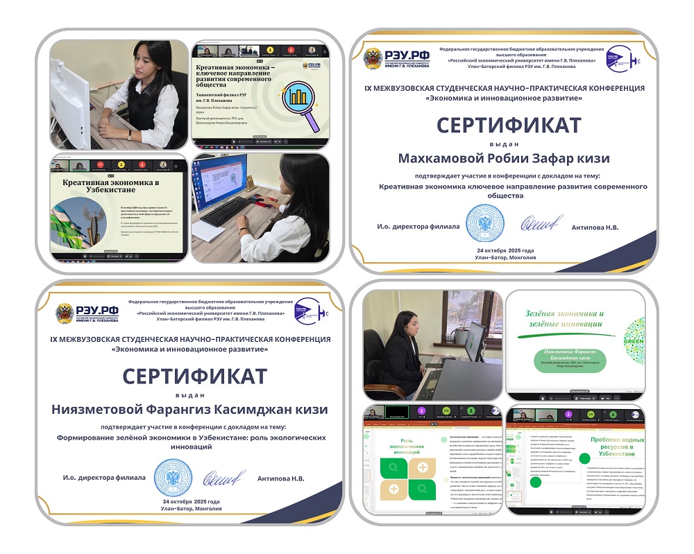 В рамках программы «Центра реализации молодежных инициатив» направленной на развитие исследовательских и лидерских компетенций у молодежи 24 октября 2025 года студентки второго курса Ташкентского филиала Российского экономического университета имени Г. В. Плеханова — Махкамова Робия Зафар кизи группы 4309 и Ниязметова Фарангиз Касимджан кизи группы 4303 — приняли участие в IX Межвузовской студенческой научно-практической конференции «Экономика и инновационное развитие», проходившей в г. Улан-Батор (Монголия). Студенты получили сертификаты.