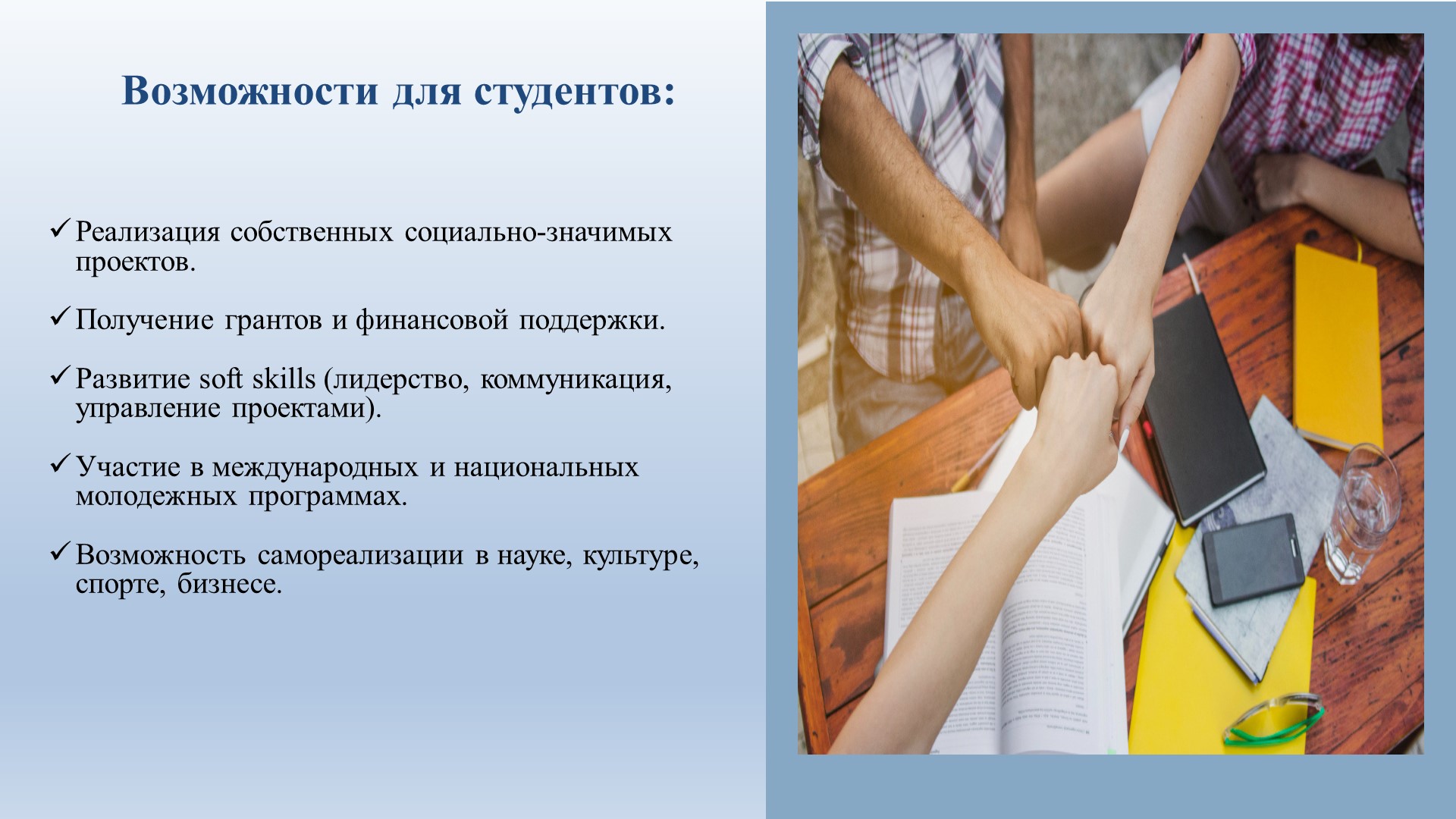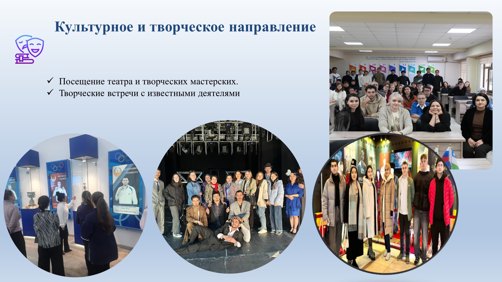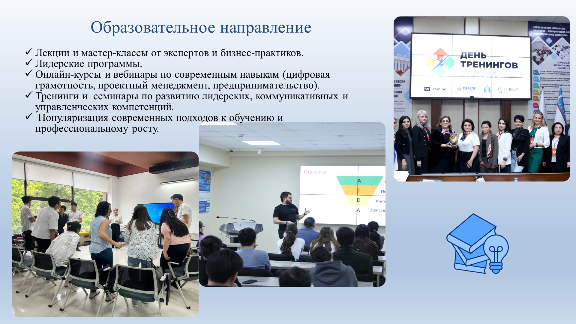 В рамках программы «Центра реализации молодежных инициатив» направленной на развитие исследовательских и лидерских компетенций у молодежи 24 октября 2025 года студентки второго курса Ташкентского филиала Российского экономического университета имени Г. В. Плеханова — Махкамова Робия Зафар кизи группы 4309 и Ниязметова Фарангиз Касимджан кизи группы 4303 — приняли участие в IX Межвузовской студенческой научно-практической конференции «Экономика и инновационное развитие», проходившей в г. Улан-Батор (Монголия). Студенты получили сертификаты.