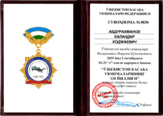 В соответствии с постановлением Исполнительного комитета Федерации профсоюзов Узбекистана от 2 октября 2025 года № 16–21 «С» руководителю Ташкентского филиала Российского экономического университета имени Г. В. Плеханова, академику Каландару Абдурахманову вручен памятный нагрудный знак «120-летие профсоюзов Узбекистана», по представлению председателя Федерации профсоюзов Узбекистана Кудратиллы Рафикова.