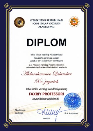 Академия Министерства внутренних дел Республики Узбекистан присвоила академику Каландару Абдурахманову звание «Почётный профессор». Решение принято Постановлением Совета Академии МВД Республики Узбекистан от 25 сентября 2025 года № 6.