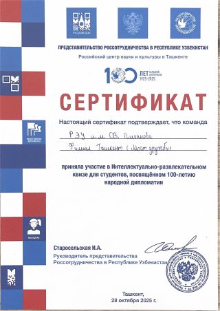 Студенты Ташкентского филиала приняли активное участие в Интеллектуально-развлекательном квизе, посвящённом 100-летию народной дипломатии. Мероприятие было организовано представительством Россотрудничества в Республике Узбекистан и включало несколько туров: музыкальные задания, логические вопросы, специальный тематический раунд, а также другие интерактивные конкурсы, направленные на развитие эрудиции, командного духа и творческого мышления.