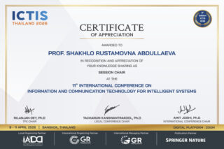 Эксперты Ташкентского филиала, специалисты кафедры «Цифровая экономика и финансы» 9-10 апреля дистанционно приняли участие в XI Международной конференции по информационным и коммуникационным технологиям для интеллектуальных систем, которая проходила в Бангкоке, Таиланд.